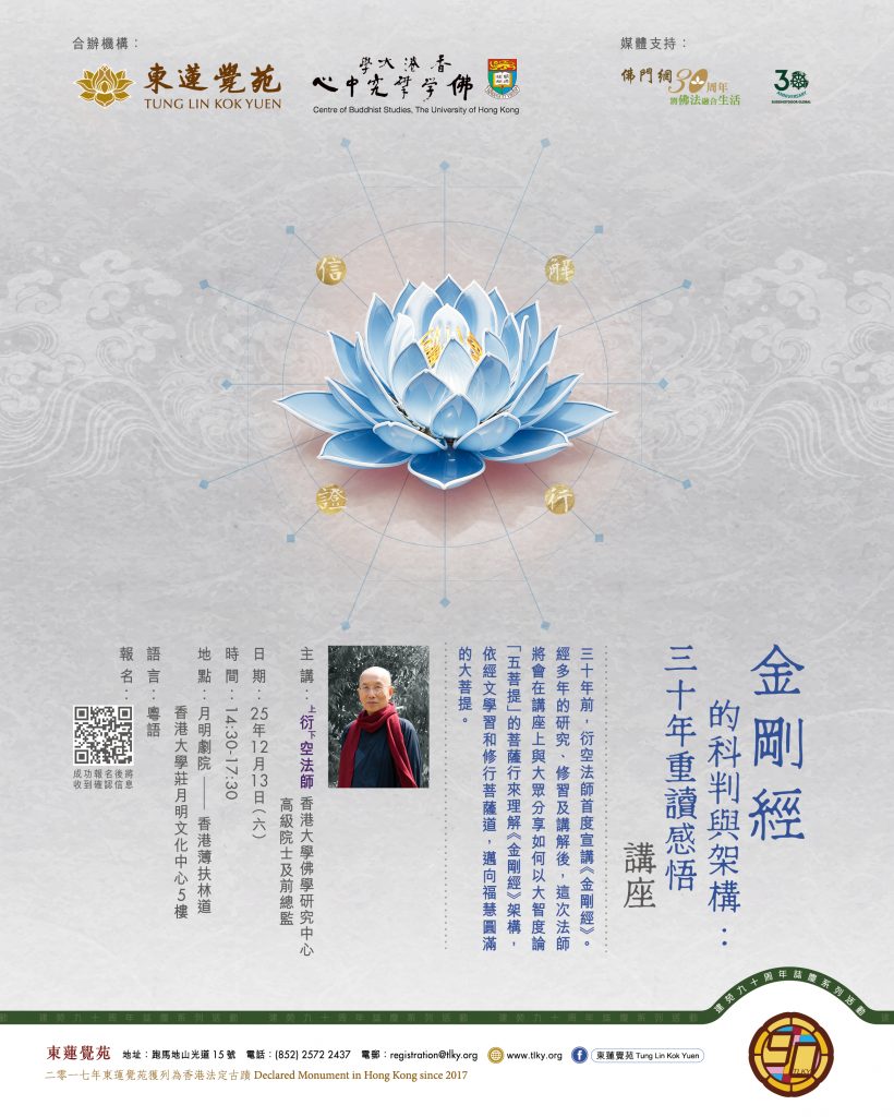 三十年前,衍空法師首度宣講《金剛經》。經多年的研究、修習及講解後,這次法師將會在講座上與大眾分享如何以大智度論「五菩提」的菩薩行來理解《金剛經》架構,依經文學習和修行菩薩道,邁向福慧圓滿的大菩提。