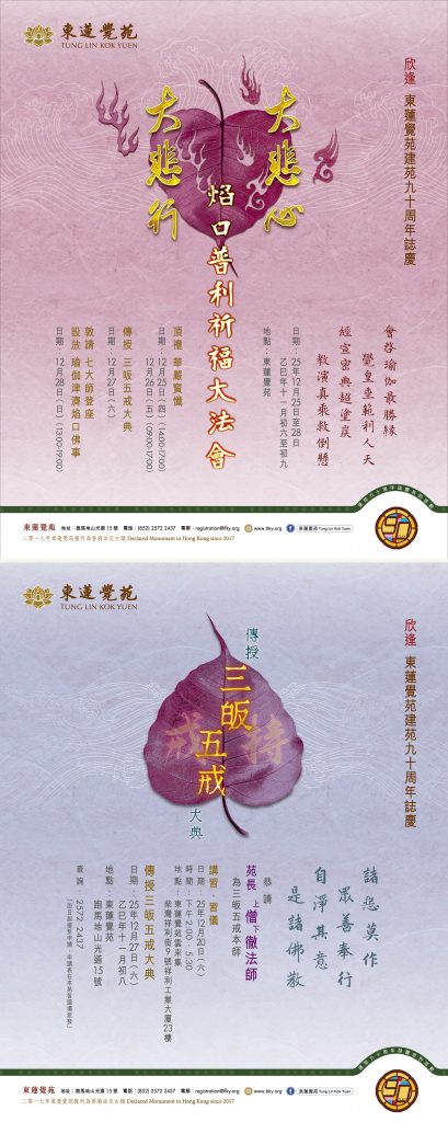 啟建一場為期四天、別具意義的祈福大法會。法會內容包括頂禮《華嚴寶懺》,並敦請七大師登座,設放「瑜伽津濟焰口佛事」,以此圓滿東蓮覺苑建苑九十周年誌慶。本次佛事旨在藉由十方悲心願力與大眾廣結善緣,讓大眾得以供養三寶,培養慈悲和智慧,增長善法。並發廣大菩提心,平等布施予六道眾生,尤其是餓鬼道眾生,達至自利利他的殊勝功德。透過這個難得的布施機會,參與者將彼此結下善緣,讓整個法會在和諧與喜悅中圓滿進行。讓大眾將法會中的歡喜與法喜帶回日常生活,延續善念,廣傳福德。同時,法會期間亦將舉行「三皈五戒」傳授大典,接引初機。三皈五戒為學佛之根本,受持清淨戒律乃修行之要門,功德殊勝,意義深遠。
