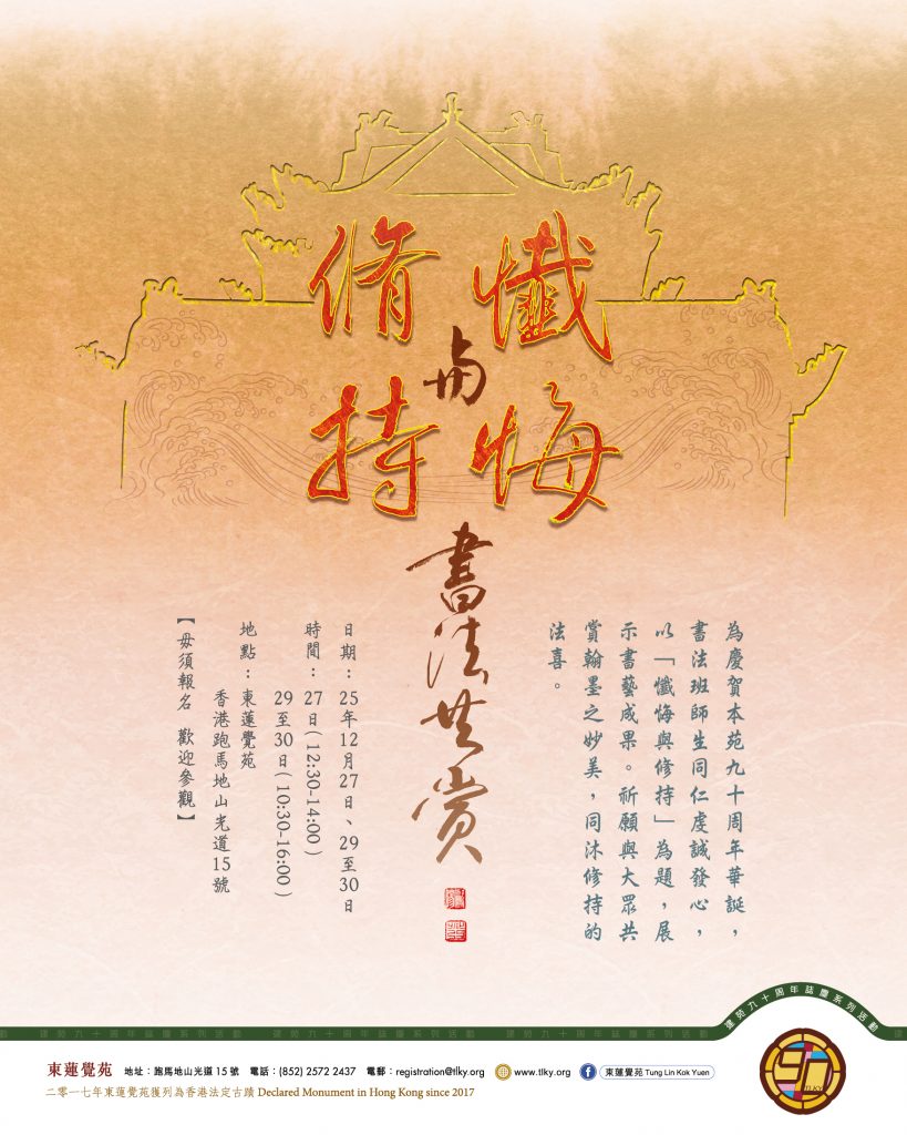為慶賀本苑九十周年華誕,書法班師生同仁虔誠發心,以「懺悔與修持」為題,展示書藝成果。祈願與大眾共賞翰墨之妙美,同沐修持的法喜。