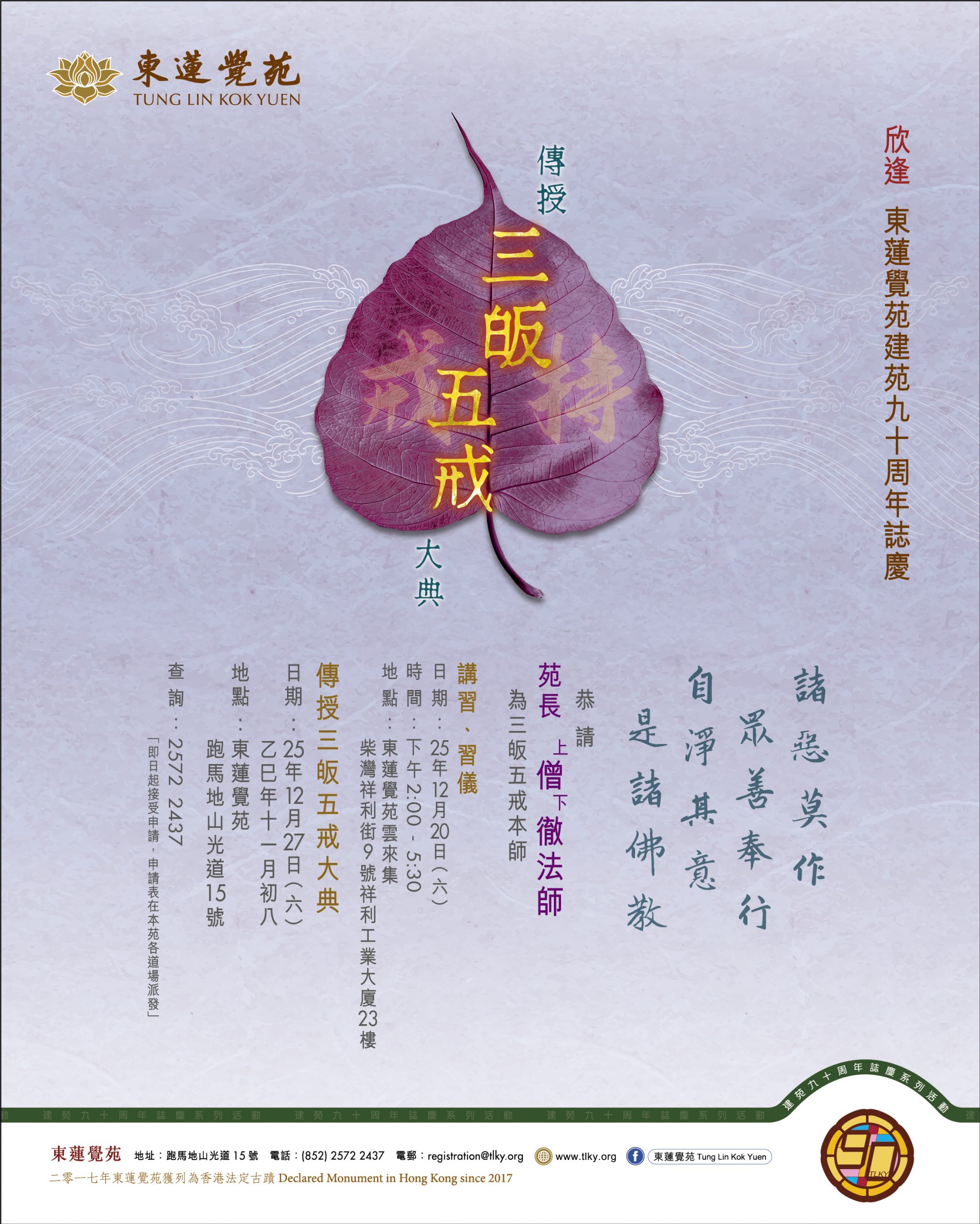 傳授三皈五戒大典日期:25年12月27日(六)地點:東蓮覺苑(跑馬地山光道15號)查詢:2572 2437『即日起接受申請,申請表在本苑各道場派發』