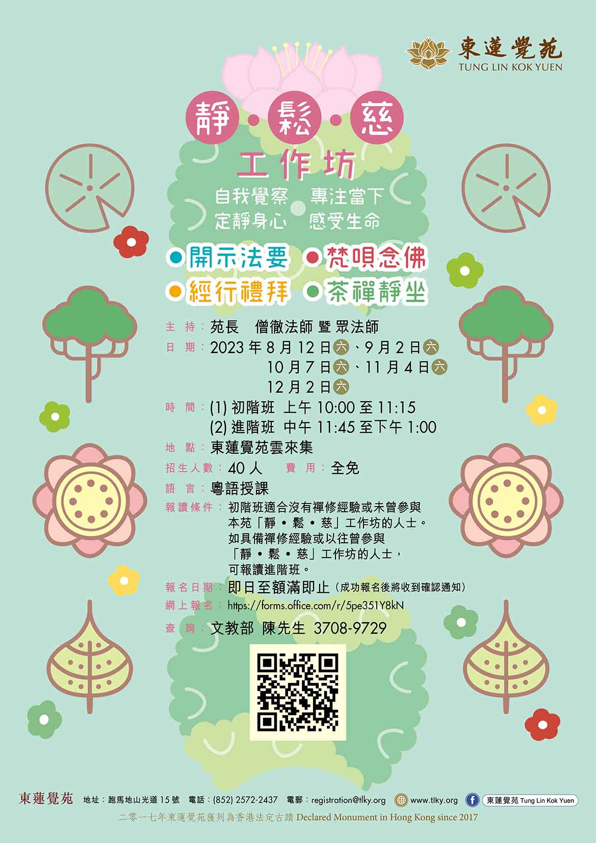 東蓮覺苑即將開辦「靜‧鬆‧慈」工作坊,由苑長及眾法師指導學員,學習靜心而放鬆身心,心柔軟才能包容一切,慈悲和智慧由此培養孳長。工作坊內容包括開示法要、梵唄念佛、經行禮拜及茶禪靜坐,方便學員在日常生活中實踐。