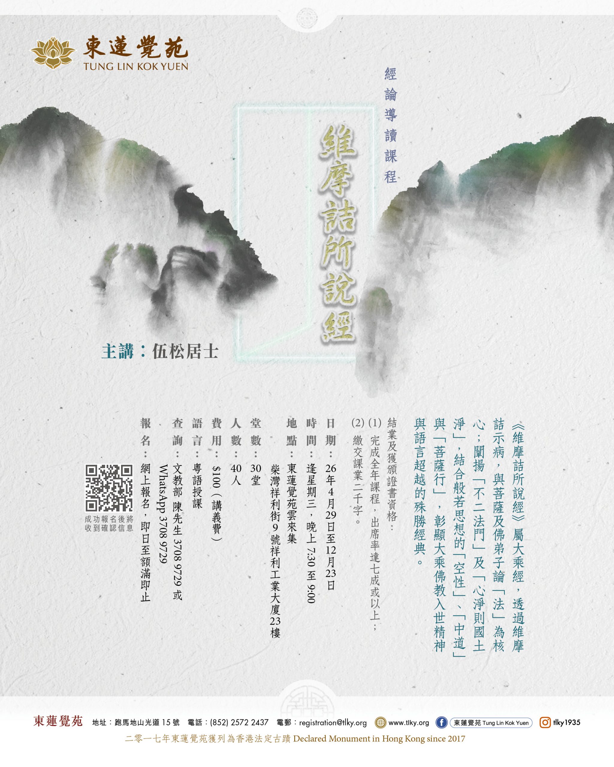 《維摩詰所說經》屬大乘經,透過維摩詰示病,與菩薩及佛弟子論「法」為核心;闡揚「不二法門」及「心淨則國土淨」,結合般若思想的「空性」、「中道」與「菩薩行」,彰顯大乘佛教入世精神與語言超越的殊勝經典。
