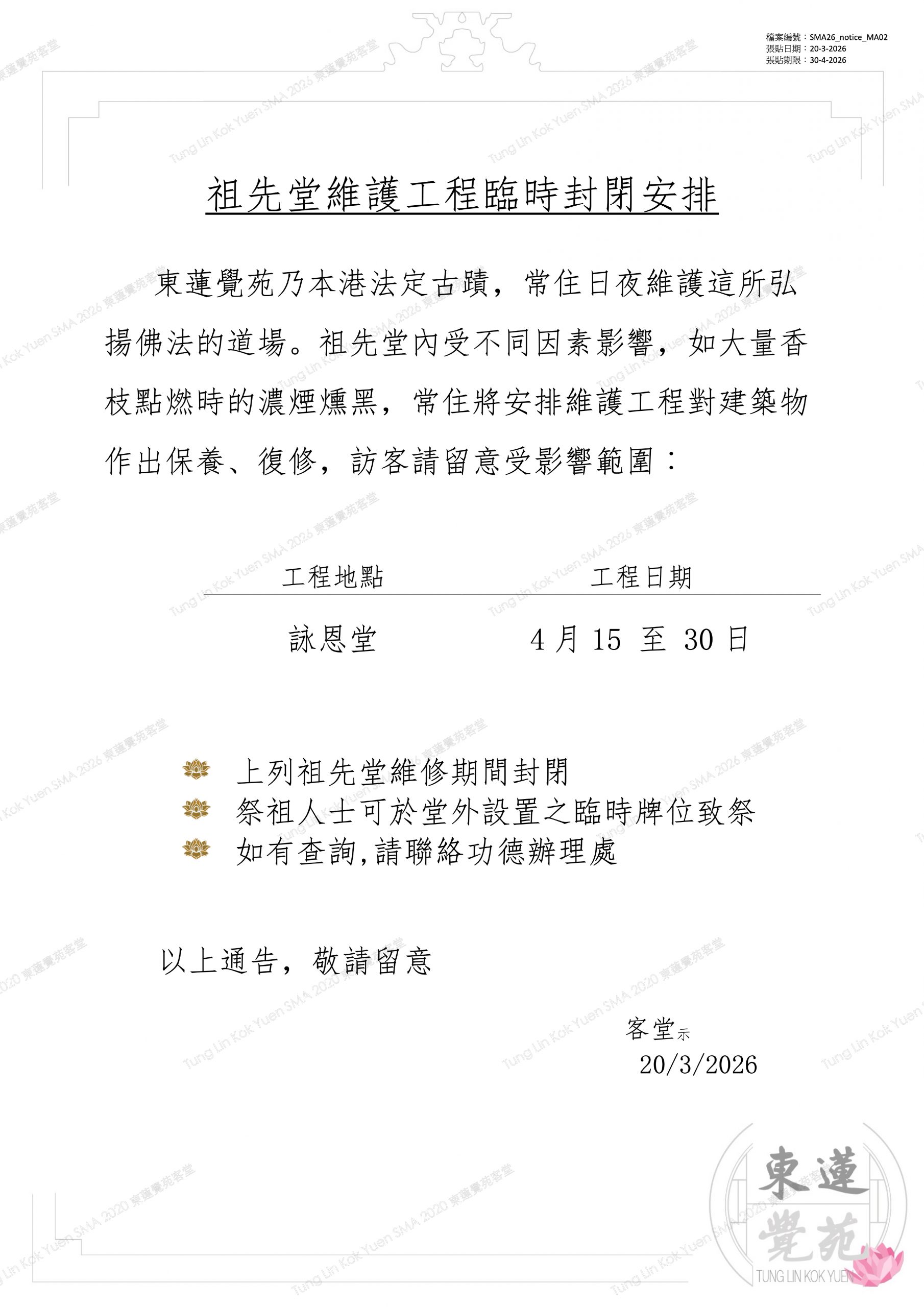常住將安排26年3月23至26日,於大雄寶殿進行維護工程。期間訪客不能進入相關受影響範圍,請避免在上述日子到訪。3/3/2026