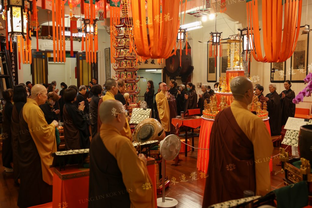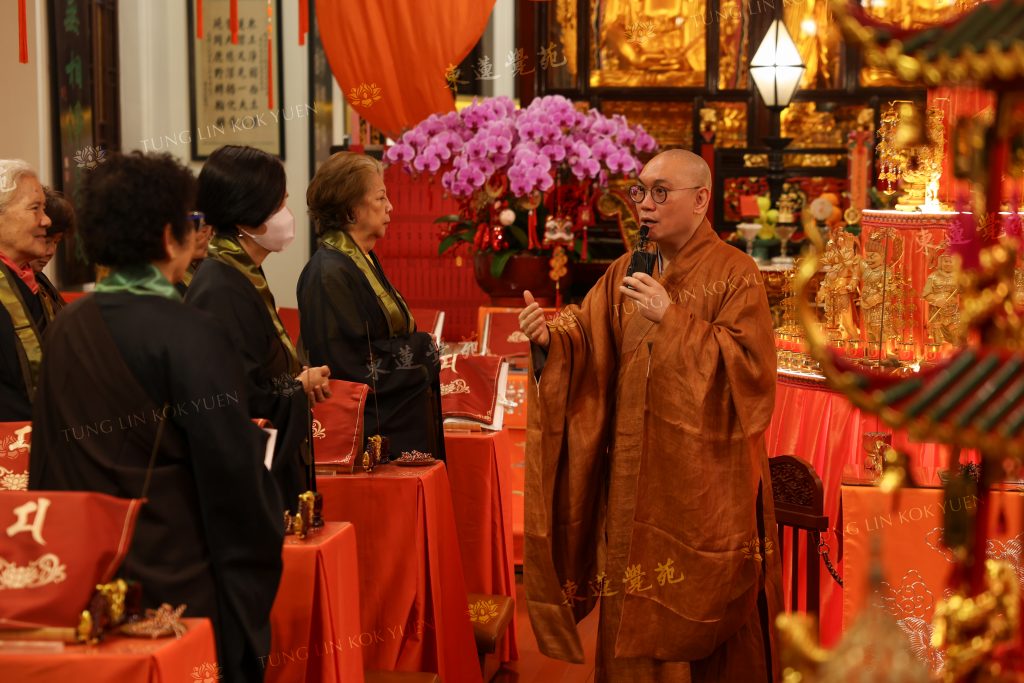 今日法師會帶領大家念誦《消災解冤釋結寶懺》。我們進入大殿,會看到一座七層藥師佛塔。俗語云:「救人一命,勝造七級浮屠」,浮屠即是指佛塔。在佛教中,「七」含有吉祥的意義,亦象徵我們行六度萬行,便能逐漸超越煩惱,跳出三界。