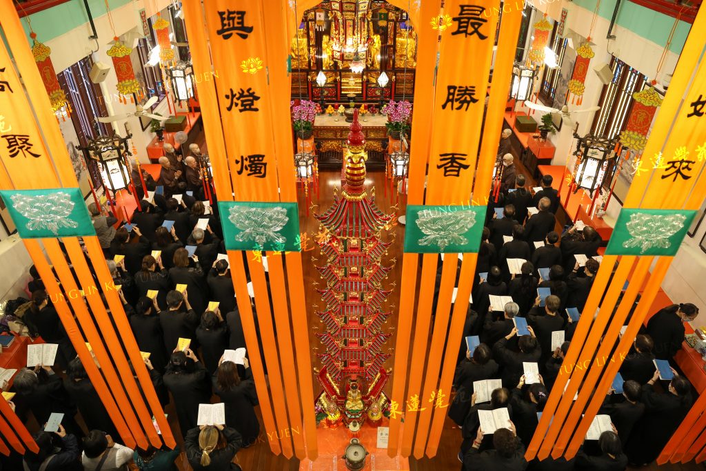 今天以佛教四眾的因緣,在東蓮覺苑舉行往生普佛,恭誦《佛說阿彌陀經》,稱念阿彌陀佛萬德洪名聖號,以此功德一同回向:「願生西方淨土中,九品蓮華為父母;花開見佛悟無生,不退菩薩為伴侶」。回向大埔宏福苑五級火警的死難者、英勇殉職的消防員及一切有情眾生。願念佛力量助亡者早登善趣,傷者早日康復,死傷者的家人與一切眾生心安自在。共同將念力化成祥和氣氛,願香港努力繁榮,佛教徒向上精進。阿彌陀佛!